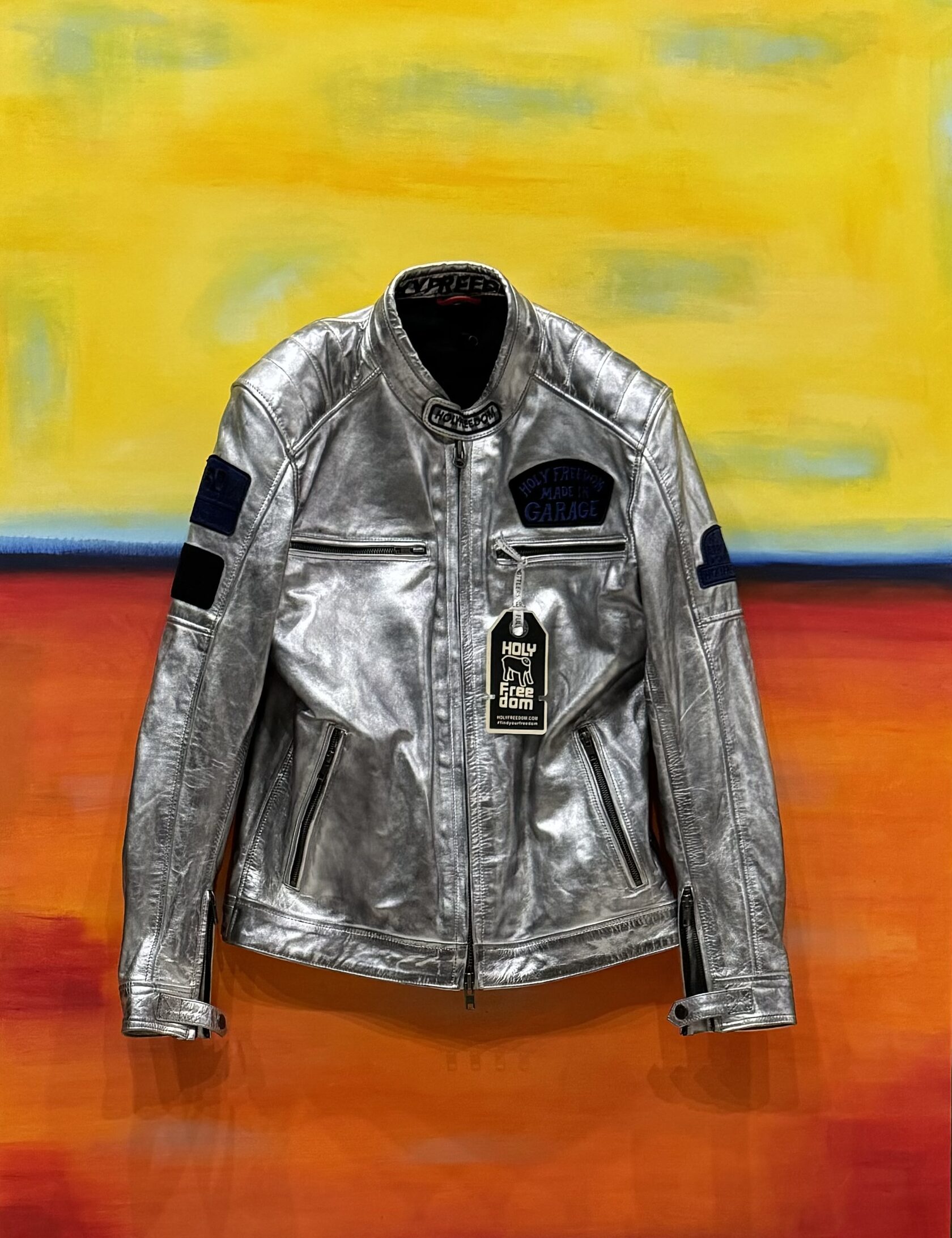 На холст выплеснули огромный поток позитива, яркости, динамики, придали структуру. Если долго смотреть на холст, то там и энергия солнца и спокойствие неба и радость света. Вы медленно нагреваетесь и осознаете, что отвести от картины взгляд трудно. После этого вся художественная энергия холста уравновешивается луной, которая символизируется серебристой курткой - таким оказалось ее реальное предназначение. Она холодная, но красивая, фактурная, спокойная. Она почти естественным образом находит свое место на холсте и как бы прилипает к нему, при этом ее можно трогать и она будет двигаться. Вы можете придавать куртке разные положения и тем самым менять визуальное восприятие объекта. Это гениальная работа. Низкий поклон художнику, спасибо, что дочитали.